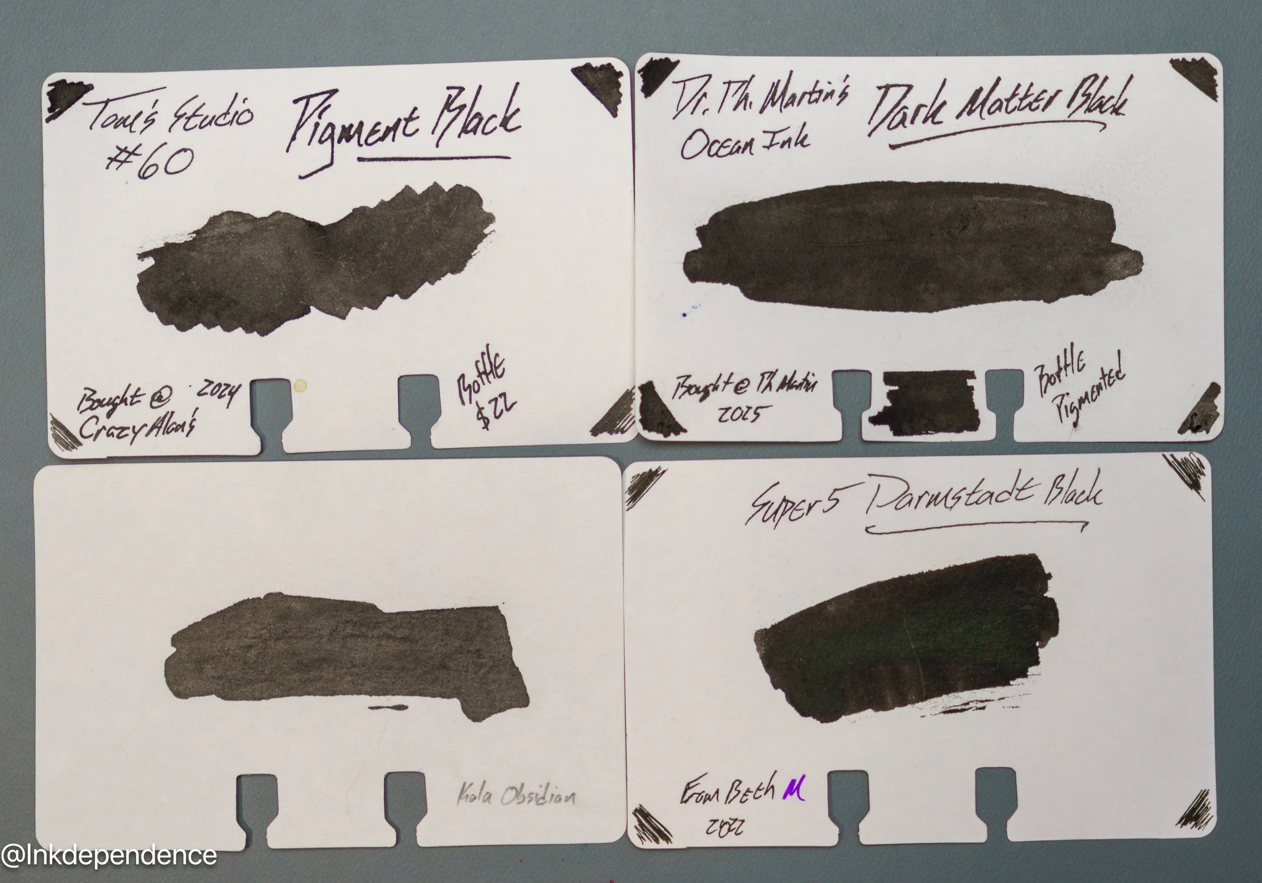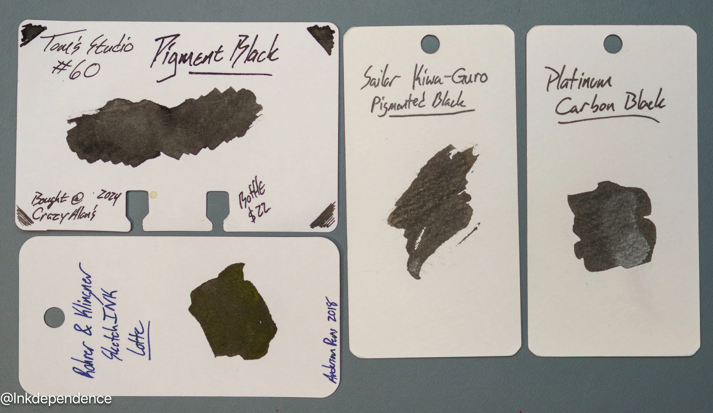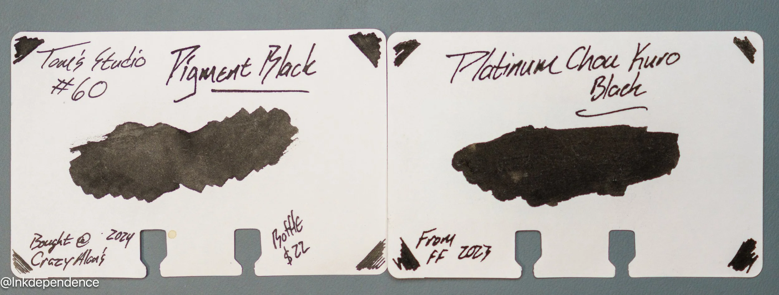 Here are a whole bunch of different black inks compared to the Pigment Black swatch. Some of these are pretty close, and others are darker or sheenier. There is more variation amongst black inks than most would think, so pick your favorites!