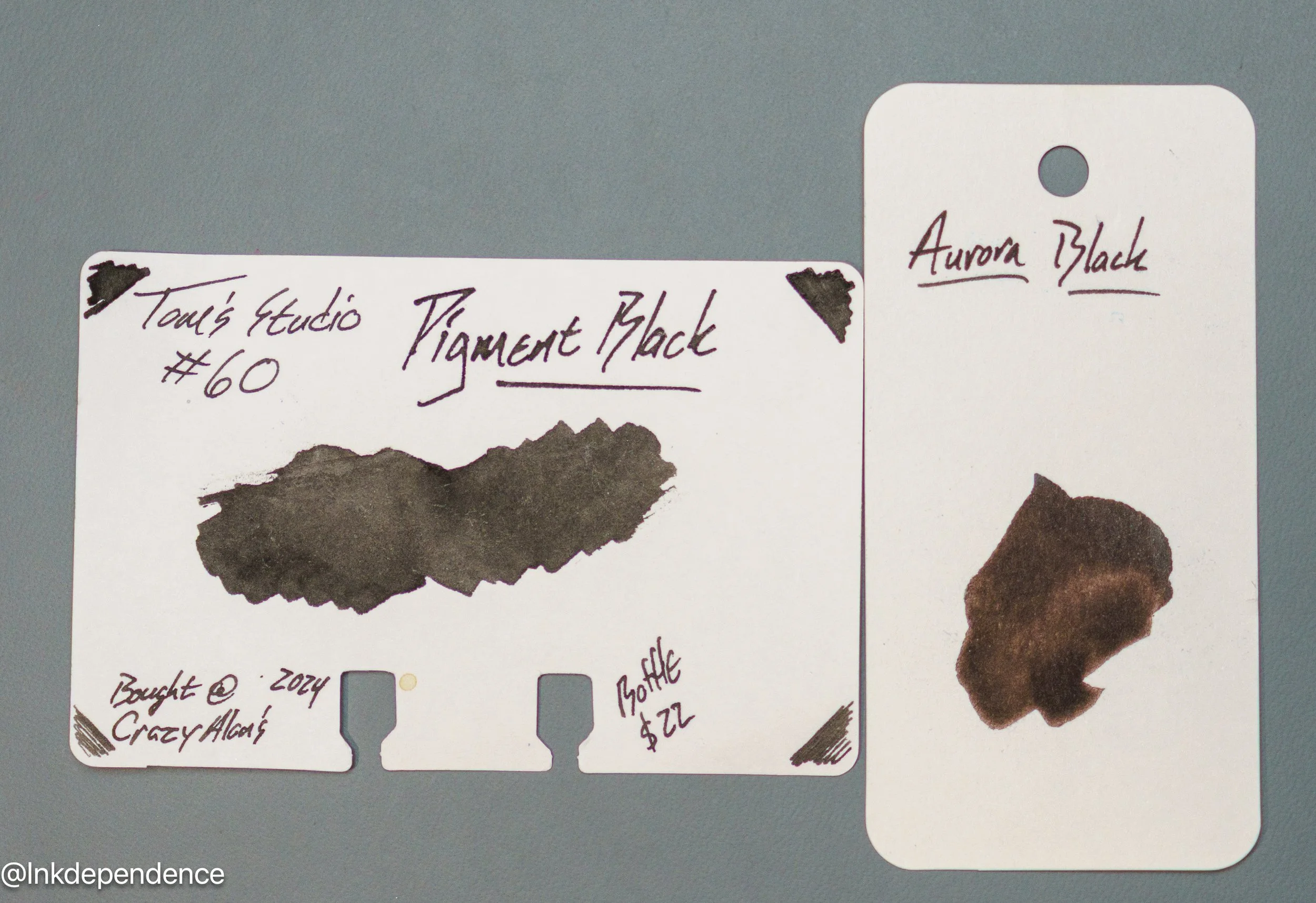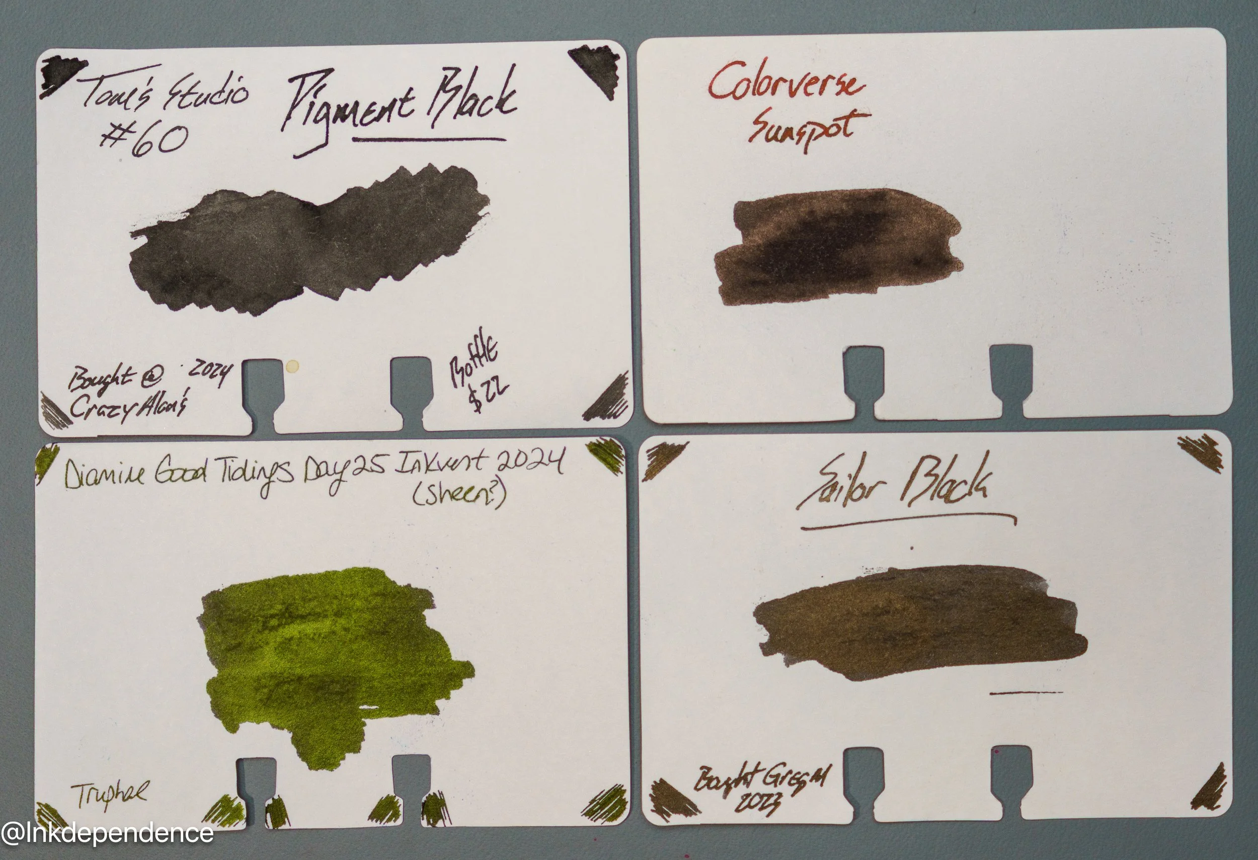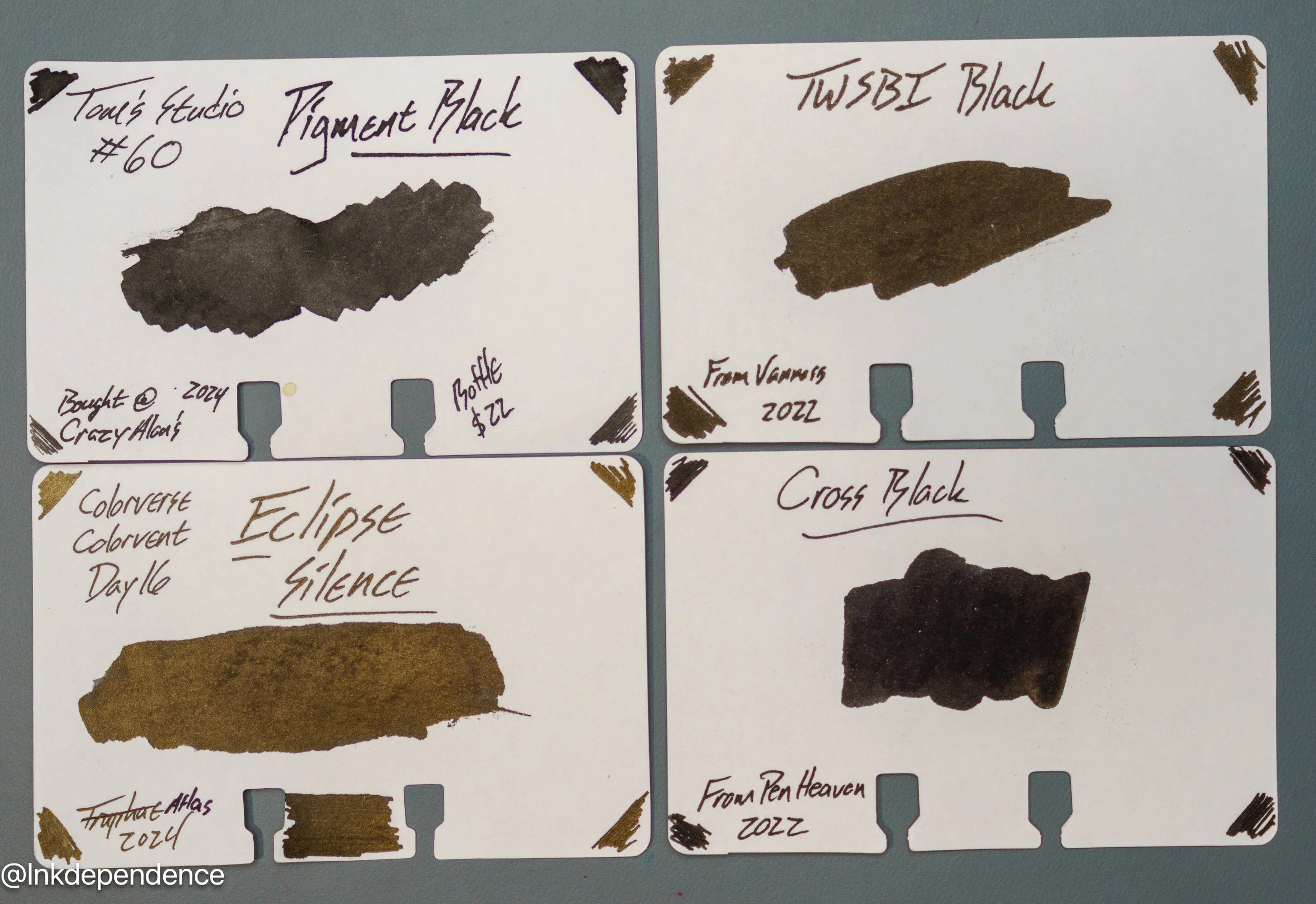Here are a whole bunch of different black inks compared to the Pigment Black swatch. Some of these are pretty close, and others are darker or sheenier. There is more variation amongst black inks than most would think, so pick your favorites!